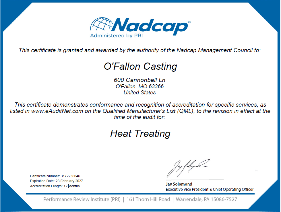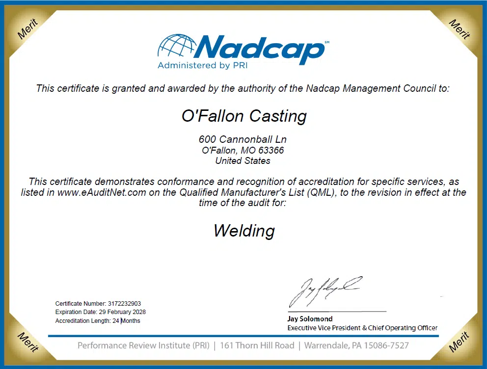 O'Fallon Casting is fully accredited to produce aerospace and defense quality castings.  Our quality management system is ISO9001 and AS9100 accredited, and our Heat Treat, Non-Destructive Testing and Welding processes are NADCAP certified.